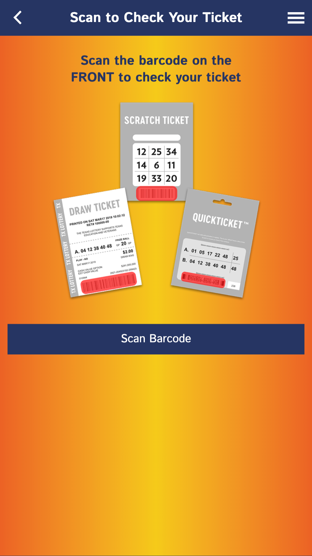Scan the barcode on the front of your draw game and scratch tickets for winning status. The retailer will prominently display the Texas Lottery Ticket Sales License where tickets are sold. Great app for people who lose track of time and miss chances to.
